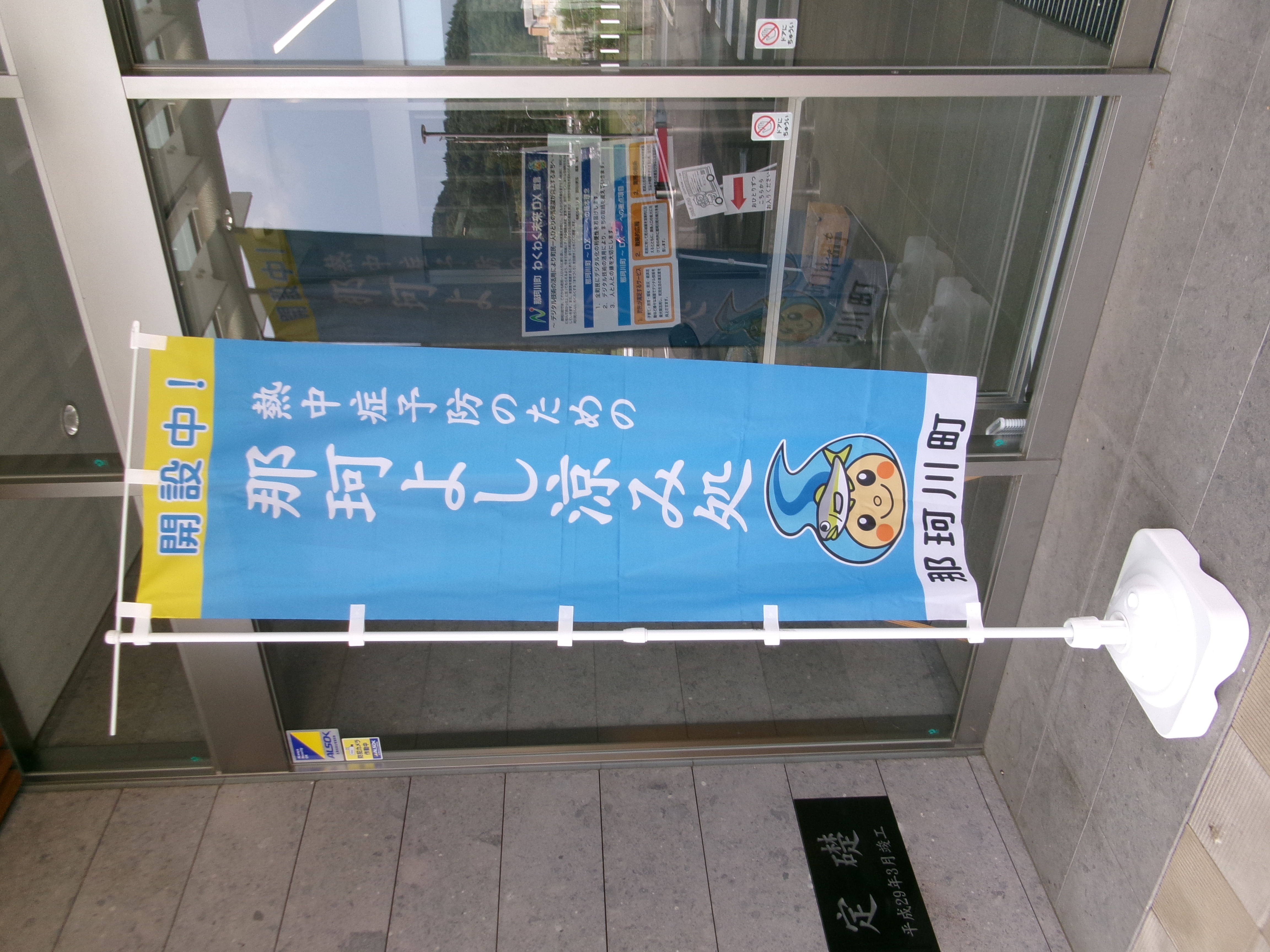 涼み処ポスター(pdf 281 KB)とのぼり旗を掲示しています。(こちらは見本です)