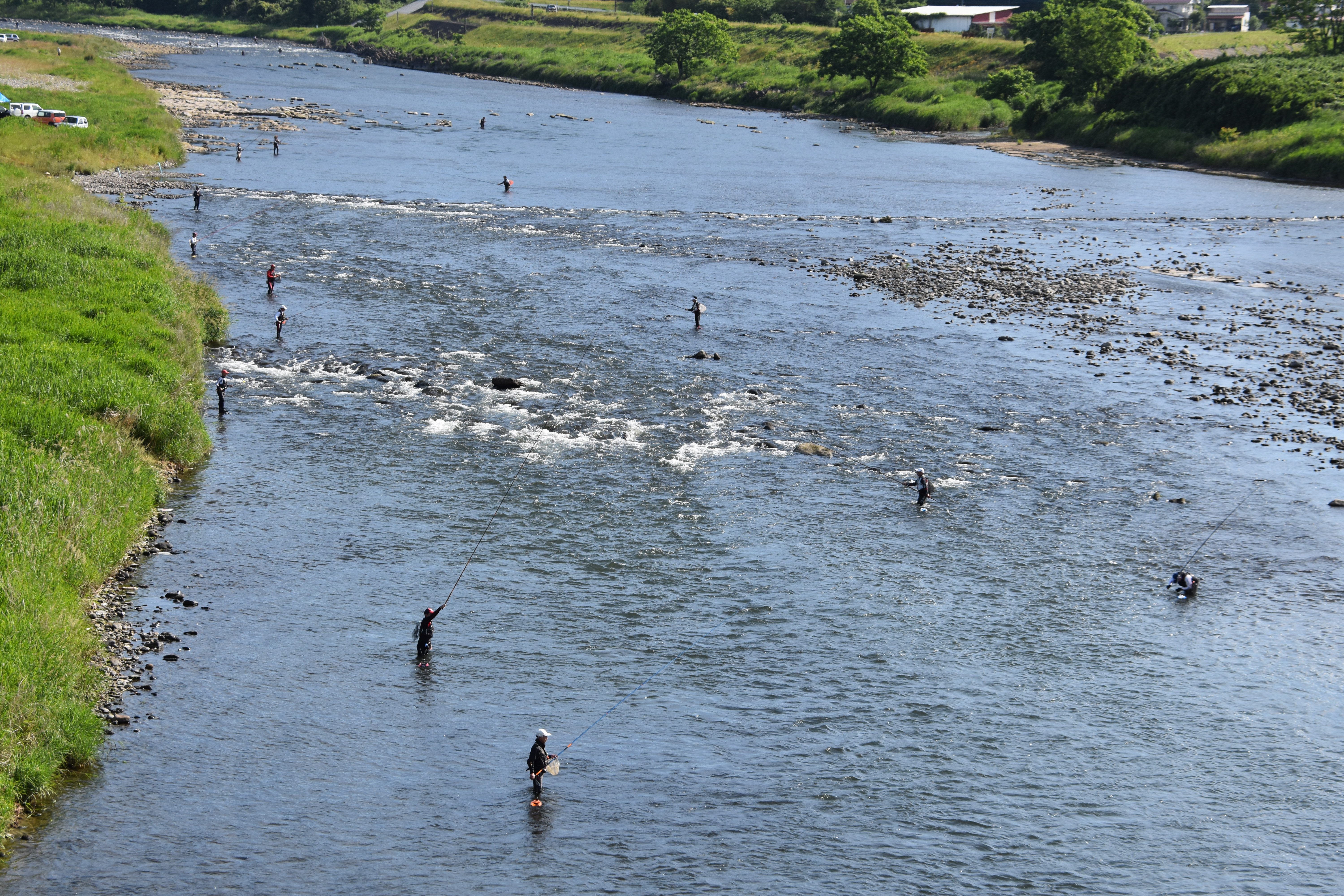 那珂川でアユ釣りを楽しむ人々