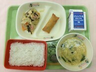 | 1月19日(月) 中華丼 牛乳 ごはん 中華丼の具 春巻き 卵入りコーンスープ |