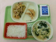 2月9日(月) ごはん 牛乳 餃子の甘酢あんかけ➁ 豚キムチ わかめのかき玉汁 |