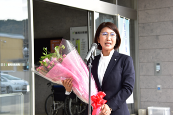 11月6日、益子純恵那珂川町長が役場に初登庁しました。 到着した益子町長は、職員や支援者らおよそ100人に拍手で迎えられ、花束が手渡されました。